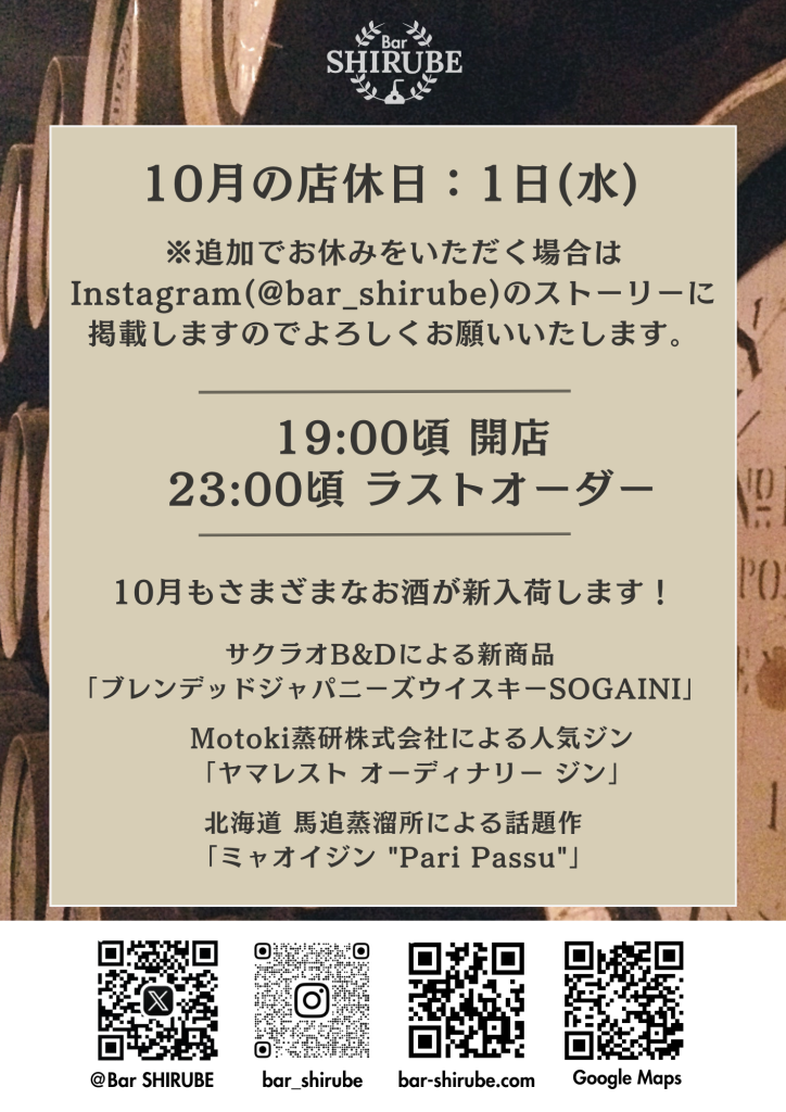 10月の営業スケジュールのお知らせです! 朝晩は肌寒さを感じる日も出てきました。夜のお散歩ついでに1杯だけでもお気軽にご来店ください! 今月もよろしくお願いいたします。 -