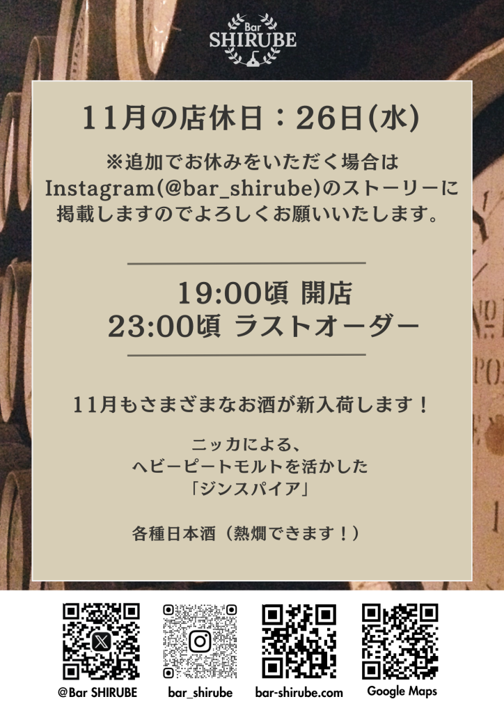 11月の営業スケジュールのお知らせです! どんどん寒くなっておりますが、おでんや赤ワイン煮など温かいお料理も準備しておりますので、1杯だけでもお気軽にご来店ください! 今月もよろしくお願いいたします。 -