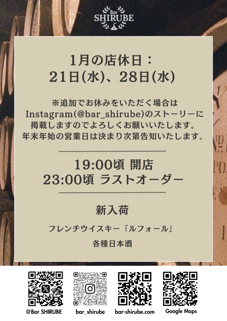 1月の営業スケジュールのお知らせです! 2025年はありがとうございました。みなさまのおかげで、営業を続けられております。心より、感謝申し上げます。 まずは1月から、今年もよろしくお願いいたします。 -