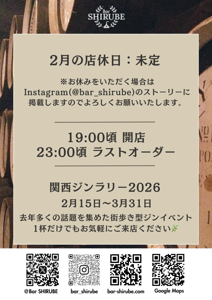 2月の営業スケジュールのお知らせです! 今月から「関西ジンラリー」が始まります! 去年も多くの話題を集めた街歩きイベント!一杯だけでもお気軽にご来店ください。 今月もよろしくお願いいたします。 -