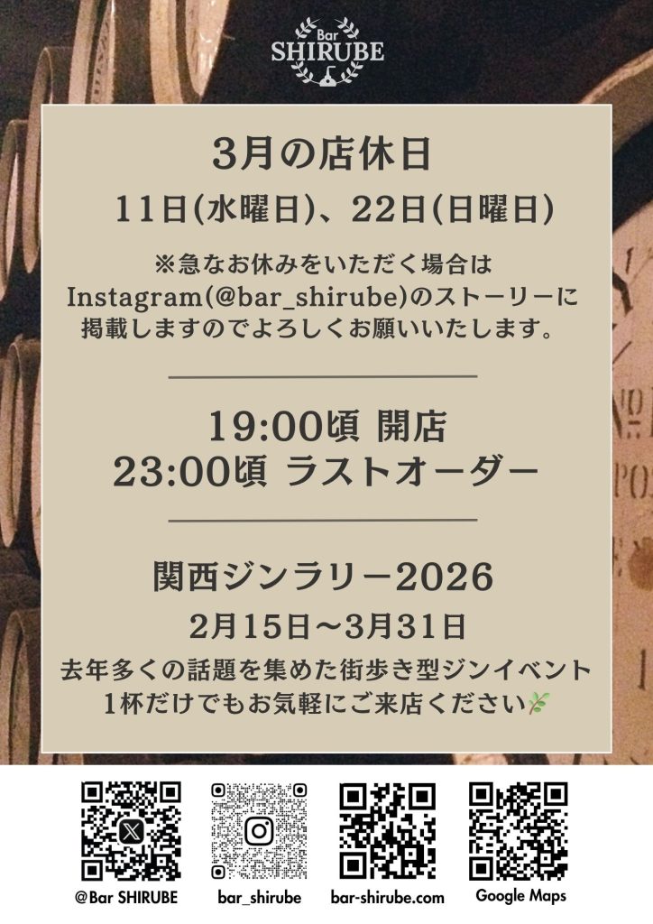 3月の営業スケジュールのお知らせです! 先月に引き続き、「関西ジンラリー」が行われております。一杯だけでもお気軽にご来店ください。 今月もよろしくお願いいたします。 -