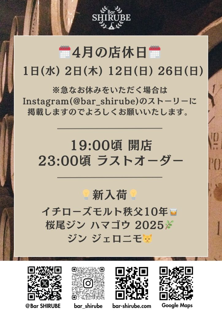 4月の営業スケジュールのお知らせです! 暖かくなり、飲み歩きにも最適な時期になってまいりました。新年度を迎えお忙しい方も多いかと思いますが、お時間ございますときにはいつでもお立ち寄りください。 今月もよろしくお願いいたします。 -