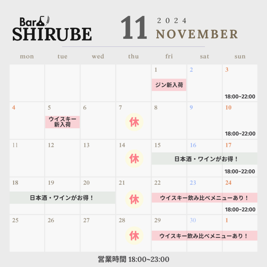 11月の営業スケジュールのお知らせです! ウイスキーの飲み比べメニューを中心に、いろいろな企画を行う予定です!今月もよろしくお願いいたします。
