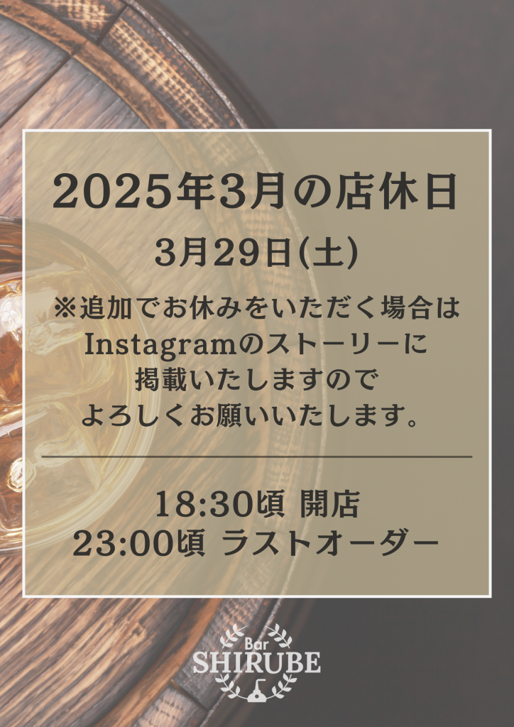 3月の営業スケジュールのお知らせです! 少しずつ春が近づいている空気を感じる3月。まだ寒さは残りますが、お近くにお越しの際はお気軽に1杯だけでもお楽しみいただければ幸いです。今月もよろしくお願いいたします。 -