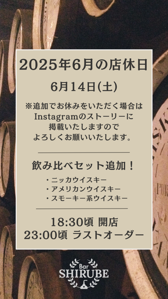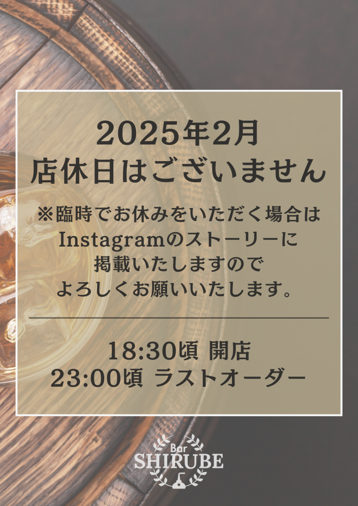 1月の営業スケジュールのお知らせです! 1月24日(金)・1月25日(土)は、スタッフのお誕生日を記念して日本酒をたくさんご用意させていただくご予定です!もちろん通常営業としてウイスキーや焼酎なども普段通りお楽しみいただけますのでご安心ください。今... -